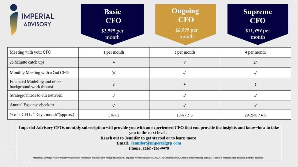 We specialize in Ongoing CFO work but everything we do is customized to your specific needs! Here are examples of Ongoing CFO pricing packages: “A leader’s job is to look into the future and see the organization, not as it is, but as it should be." – Jack Welch –